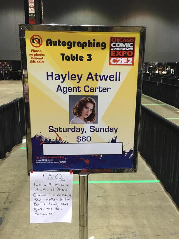 Présente pour signer des autographes, les fans faisant la queue on put trouver un papier attaché au panneau signalant la présence de l’actrice, qui disait « Nous saurons dans trois semaines si Agent Carter est renouvelée pour une nouvelle saison ou non. Mais cela semble bien partie au vu de la réponse des fans ! »